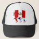 Três jogadores de futebol mostrados em silhueta na frente da bandeira peruana. O nome de país Peru está no lado