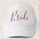 Um design de caligrafia adorável para noiva, este chapéu branco de caminhoneiro é perfeito para você. "Noiva" é escrita na frente usando uma fonte burgundy. Faça seu pedido hoje mesmo!