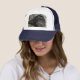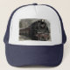 Todos a bordo! Uma fotografia de uma locomotiva vintage e de um trem enfeita este chapéu!