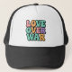 Spread positivity and peace with this eye-catching "Love Over War" hat featuring bold, puffy, bubble letters in a vibrant 70s retro style. The pastel palette of pink, orange, teal, and purple gives it a perfect vintage vibe