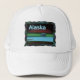 Um urso polar vagueia o gelo durante a longa noite polar; o Norte brilha em vermelho e verde à distância. A leitura de texto "Alaska" em azul e branco brilhantes também é exibida.