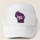 Chapéu branco de caminhoneiro com logotipo da Liga das Mulheres Eleitoras sobre o estado de Wisconsin