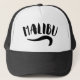 Chapéu de caminhoneiro da Califórnia em Malibu, em texto preto, com sublinhado de onda.