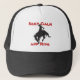 Uma imagem preta da silhueta de um cavalo e de um vaqueiro bucking é a característica neste chapéu, com o texto no vermelho "mantenha a calma e monte-a" acima e abaixo da imagem.