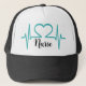 Boné de caminhoneiro com linha de batimento cardíaco EKG azul turquesa moderno. Impressão de batimento cardíaco EKG de coração turquesa, para um presente de formatura na escola de enfermagem ou faculdade de medicina ou simplesmente para o seu enfermeiro favorito! Não apenas é possível alterar as cores da fonte (e o texto, claro), mas também é possível alterar as cores do fundo, o que mudará a cor da linha do batimento cardíaco! Você pode combiná-lo com a cor favorita da sua enfermeira ou com as cores da escola, se desejar, para a formatura.