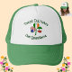 Chapéu de caminhoneiro, personalizado, com uma pedra de xamelo com uma bandeira diferente em cada folha representando as culturas mexicana, irlandesa e americana. Acima, as palavras TRÊS CULTURAS. Abaixo, UM NOME. Adicione seu nome, em letras verdes, ou de outra pessoa, no lugar apropriado, para criar um chapéu personalizado ou presente personalizado. É divertido vestir na Rua. Dia de Patrick, Cinco de Mayo e 4 de julho. Divertido em reuniões familiares também.