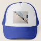 Muitos gatos de várias cores sentados em fila sobre degraus de uma escada branca com uma escadaria de ferro em forma azul no corredor de uma vila grega, Cíclades, ilha do mar Egeu, Grécia. Este chapéu é uma ideia de presente para amantes de gatos. Uma foto fofa com gatos encantadores tirada por Katho Menden.