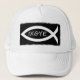 Nos círculos cristãos, o símbolo do peixe é muitas vezes usado para simbolizar o Cristo de Salvador Jesus. A língua dominante da Igreja primitiva era o grego, e em grego a frase "Jesus Cristo, Filho de Deus, Salvador" produziu a sigla ICHTHYS, a palavra grega para peixes. Um poema cristão do segundo século soletra a palavra com as primeiras letras de cada linha. Vista este chapéu para testemunhar da sua firme crença em Jesus Cristo, Filho de Deus, Salvador. O chapéu tem um peixe branco em preto com a sigla IXOYE dentro. Tudo tem uma fronteira branca.
