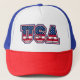 Este caminhoneiro personalizado que apresenta um design que exibe a palavra "EUA" em uma impressão de sinalizador de Stars & Stripes em negrito e letras vermelhas, brancas e azuis, além de contorno preto neste orgulho do tema EUA. Este chapéu é confortável, casual e ajustável de 17 a 24" com um excelente de 100% de espuma de nylon frente e de nylon para uso diário ou em qualquer ocasião especial.