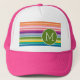 As listras femininas e uma combinação divertida de cores fazem disto um chapéu monograma que se destaca quando vestido. Um padrão ousado e colorido com um lugar para personalizar.