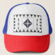 Este boné apresenta um padrão geométrico abstrato moderno com um diamante recorrente e um design de linha. O padrão azul e branco nítido da meia-noite é exibido proeminentemente na frente, enquanto a borda vermelha e as costas dão uma sensação ousada e patriótica. É um acessório na moda, perfeito para adicionar um toque de estilo único e um pop de cor a qualquer aspecto casual.