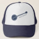 Adicione o nome da sua banda de bluegrass, o seu próprio slogan engraçado ou o nome do seu banjo favorito para criar um chapéu do tipo. Este chapéu apresenta uma ilustração de um banjo em azul marinho com a sua própria mensagem expressa em termos de coordenação da inscrição azul.