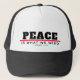 Trucker Hat preto e branco com "PEACE IS What WE NED" com uma linha vermelha ampla sob PEACE também com I-BONE LTD. no fundo. Parece que a paz foi tirada de nós. A guerra ou a ameaça de guerra está em todos os lugares que você olha.