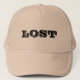 Um chapéu de caminhoneiro de cor khaki que diz "PERDIDO" na frente. Você também pode design suas próprias fotografias, obras de arte, palavras e gráficos para criar um único chapéu de caminhoneiro americano! Há uma variedade de cores diferentes disponíveis para você escolher.