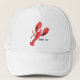 Chapéu divertido para amantes do mar. Apresenta grande lagosta de cor vermelha com texto de pronúncia fonética.