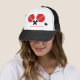 Rackets de pingue-pongue de tênis de mesa e um chapéu de caminhoneiro preto, vermelho, preto, que mostra um ícone de pictograma minimalista de raquetes de tênis preta vermelha e bola e seu texto sobre fundo branco.