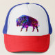 trabalho de arte colorida de um búfalo bisonho em todas as cores do arco-íris num chapéu de caminhoneiro.