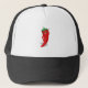 Um personagem de desenho animado de pimenta vermelho e quente. Design original. Chapéus de caminhoneiro personalizados. Ideia do presente.