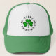 Um chapéu de caminhoneiro com um design de trevo verde e uma RUA preta "FELIZ". "O DIA DE PATRICK" escreve em volta.