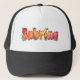 Calling all Sabrinas! This adorable trucker-style baseball cap features a fun, personalized graphic on the front panel. The name "Sabrina" is spelled out in bubbly, sunset-colored letters decorated with wildflowers and cute honeybees.