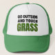 Engraçado ir lá fora com o chapéu de caminhoneiro com tipografia ousada e gramíneas verdes.