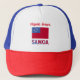 Chapéu de caminhoneiro personalizado apresenta a bandeira samoana vermelha, branca e azul com a palavra SAMOA abaixo nas cores da bandeira. Personalize com seu nome para um toque especial. Ou, crie um presente de um chapéu de caminhoneiro adicionando o nome de outra pessoa. Divertido para usar em reuniões de família, grupos de viagem e clubes. Presente muito apreciado no Dia das Mães ou Dia dos Pais.