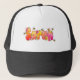 Calling all Sarah! This adorable trucker-style baseball cap features a fun, personalized graphic on the front panel. The name "Sarah" is spelled out in bubbly, sunset-colored letters decorated with wildflowers and cute honeybees.