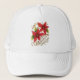 Linda ilustração de vintage design de folhetos de animação de Feliz Natal com as palavras "Saudações da Estação" escritas em letras de ouro. O texto está rodeado de flores vermelhas de poinsettia florescentes com folhas verdes.