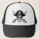 Skull and sabers, pirate skull and crossbones jolly roger grim reaper cartoon wearing captain a hat and eye patch, black and white