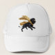Um leão negro voador com capa de ouro está em um gato de beisebol.
