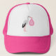 Este chapéu espetacular apresenta uma imagem gráfica de uma linda Stork branca com penas pretas segurando-as num pacote de cobertores rosa claro. Há um texto cor-de-rosa no pacote que diz "Baby Girl". Esta design é perfeita para celebrar uma menina.