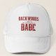 Um chapéu de caminhoneiro divertido para as mulheres que vivem no campo. "Backwoods Babe" texto vermelho-escuro angustiado com rico floresce