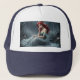Este é o chapéu de caminhoneiro. A cor do chapéu é azul grosso. A design é vista como uma mulher. Este chapéu é atraente, na moda