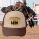 Termine a grande noite do noivo com estilo western! Esse robusto chapéu de caminhoneiro para despedida de solteiro apresenta quatro silhuetas de cowboy cavalgando para frente contra um pôr do sol ousado com listras coloridas, junto com a frase “O Último Rodeio do Noivo”. Personalizado com o nome do padrinho, é perfeito para manter a turma da festa fácil de identificar durante os bares, aventuras ao ar livre ou celebrações com tema country. Um ótimo souvenir para despedidas de solteiro em Nashville, Austin, Las Vegas ou churrasco no quintal.