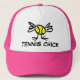 Um presente de chapéu de tênis da garota bonita. Chapéu de caminhoneiro Tênis para senhoras. Personalize este chapéu de senhoras com seu próprio texto ou nome personalizado para torná-lo um presente de tênis especial. Design cor-de-rosa com um desenho animado de bola de Pintinho Tênis.