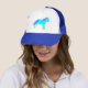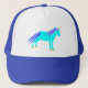 Este chapéu incrível apresenta uma imagem de arte digital de um lindo e mágico bebê unicórnio azul. O corpo principal do unicórnio é azul e o homem e a cauda são dois tons diferentes de azul. O unicórnio tem cascos de ouro e uma buzina brilhante de ouro sobre sua cabeça. Tem um olho em forma de diamante azul. O unicórnio tem um grande sorriso no seu rosto.