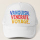 Um chapéu clássico de caminhoneiro com uma mala e uma conta curvada. O painel frontal apresenta letras ousadas, no estilo gótico, que se lê "Vanquish Venerate Voyage". A inscrição está numa cor profunda e rica, talvez um marinho escuro ou burgundy, contrastando com a cor mais clara do corpo do chapéu. Para um toque de delicadeza, considere a adição de uma pequena chama estilizada ou um gráfico de punho acima ou abaixo da letra.