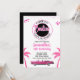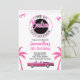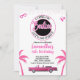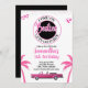 Convite de aniversário de malibu, bonitinho, rosa e preto, de boneca de moda para menina. Este convite tem palavras bonitinhas cor-de-rosa com palmeiras malibu.