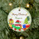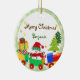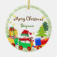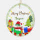 O boneco de neve no papai noel vermelho chapéu e lenço em um trem do brinquedo que esteja em azul, verde vermelho e amarelo. O fundo tem árvores com flocos de neve e estrelas. Todos os textos na parte dianteira e na parte traseira do ornamento são customizáveis. Esta é ilustração digital