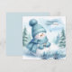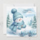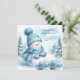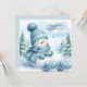 O inverno chegou e este pequeno boneco de neve está aconchegado em seu chapéu azul, cachecol e luvas. Um pequeno pássaro azul em seu ombro. Ele segura um caule de grama com um laço azul. Árvores pintadas com aquarela e cobertas de neve acentuam o fundo nevado. Um cartão de Boas Festas de inverno divertido com um boneco de neve sorridente e adorável.