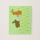 Este quebra-cabeça espetacular apresenta um par de belos coelhos de Páscoa cercados por flores amarelas daffodil. Os coelhos são castanhos com orelhas grandes, olhos negros e caudas brancas lisas. Um dos coelhos está segurando um ovo de Páscoa com um bonito arco roxo nele e está se aproximando para oferecê-lo ao outro coelho. Os daffodils são amarelos com um centro laranja brilhante.