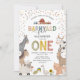 Bonito jardim de animais de companhia com zoo convites de primeiro aniversário com um simples fundo branco, animais de fazenda adoráveis incluindo uma vaca, cabra, porco, burro, cavalo, coelho, pato e um galo, e um modelo de celebração de aniversário de criança que é fácil de personalizar.