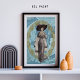 Uma bela jovem, vestida de cinza prateada e um chapéu grande e largo, com penas burguesas, olha para nós e sorri, uma capa elegante, aparada com pelo nos ombros e um pequeno saco noturno em sua mão. Essa moda se coloca contra um fundo de folhas azuis e azuis de rico e uma intrincada coroa de flores ouros. William Morris wallpaper design. Papel de lenço para a dissociação