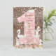 Um belo coelho, grande, faz aniversário. Convite com um grande número de cor rosa, com flores colocadas sobre um fundo de madeira marrom rústica.
