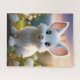 Quebra-cabeça de serra. Um coelho branco giro com olhos azuis grandes e pelo liso se senta em meio a flores brancas e folhagem verde, com um pôr do sol macio ao fundo. A cena evoca um senso de calor e serenidade.