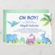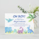 Brachiosaurus, Stegosaurus, Pterodactyls, Dinossauros que têm uma aquarela tropical verde-azulada Oh Boy Baby Shower Invtions em fundo verde - inclui uma bela e elegante tipografia com palmeiras tropicais modernas e verde para a festa especial Mãe a Ser.