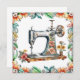 Bonito máquina de costura antiga de safra rodeada de flores de coral e folhagem verde e azul, vazio.