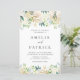 Convide a família e amigos para o seu casamento com este elegante convite de casamento floral. Apresenta ilustrações de aquarelas de rosas e peônias de marfim brancos e marfim, realces de folha de ouro verde e falsa com padrão floral correspondente. Este convite para casamento de peônias de aquarela é perfeito para primavera e casamentos no inverno.