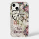 Grunge background of kraft paper effect with watercolor flowers and bird with vintage clock. A lot of letters in French.