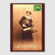 Reimpressão em cartão magnético por cartão postal. Ela tem uma loja de Natal. Ela está parada na neve e sua mão é cheio de caixas de presentes. Bonne et Heure Annee - esta foto está escrita na foto que significa em francês Good and Feliz ano novo .